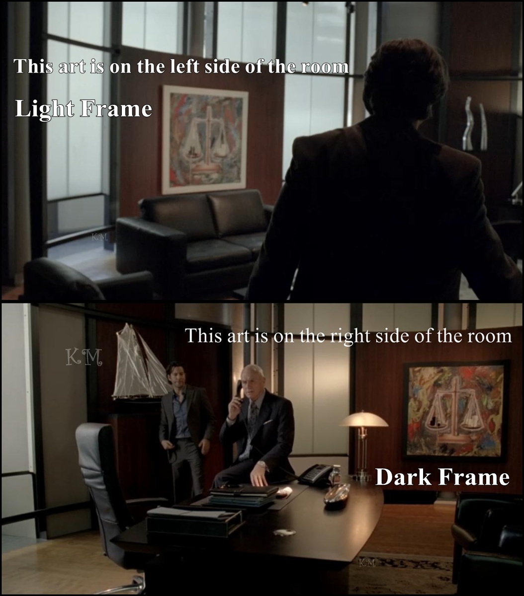 In rewatching "Happily Ever After" tonight, I may have solved the mystery of the scales of justice painting in Widmore's office. LOL One is framed white and one framed black. We never see both sides of the office at once. Why couldn't he have two paintings of the same thing framed in the black and white of the rocks on the scales?